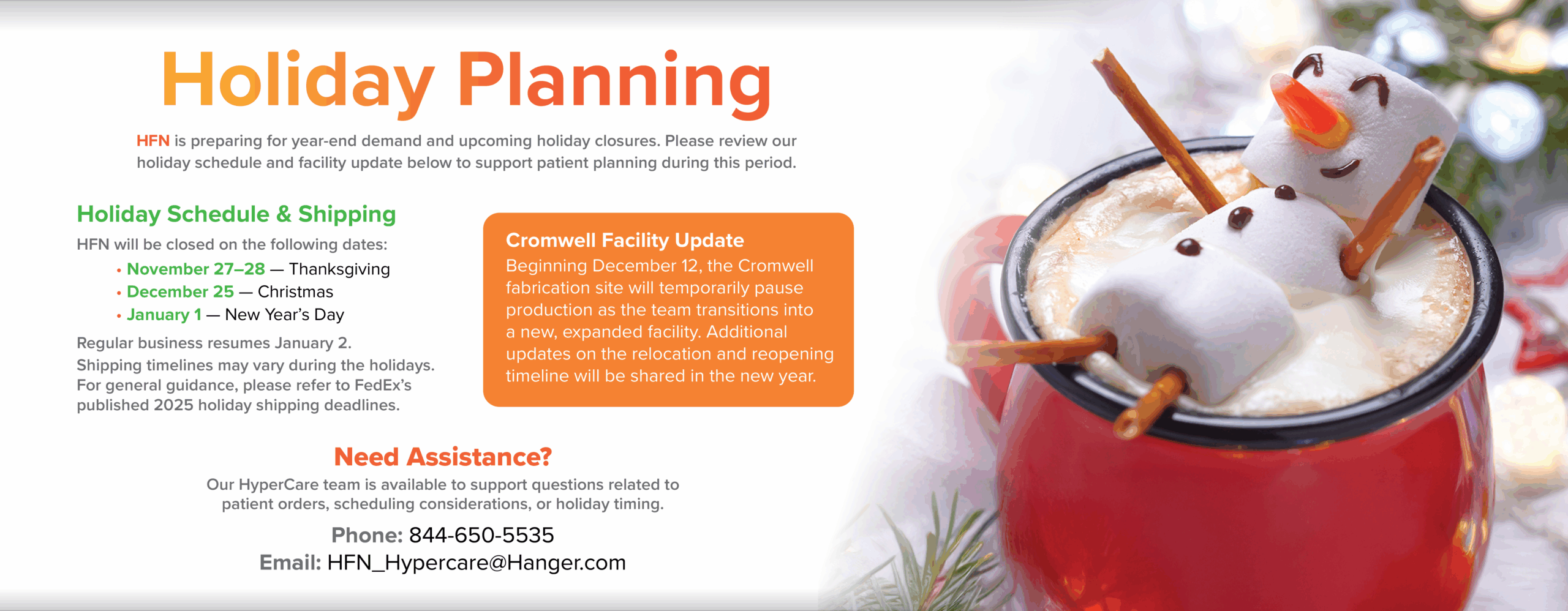 HFN is unrivaled in size and expertise. We are the largest custom O&P manufacturer in the US and leverage our technology ecosystem and national footprint. Our product portfolio offers head to toe Orthotic and Prosthetic solutions.